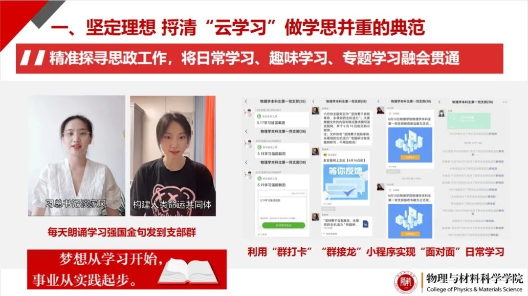 党支部精准探寻青年员工思政工作,将日常学习、趣味学习、专题学习以更加现代化的形式融入网络,融会贯通。没有线下学习机会,党支部党员就在线上利用“群打卡”“群接龙”小程序,轮流朗诵强国金句,完成学习强国积分接龙,实现“面对面”日常学习;没有现场活跃的气氛,支部就组织学习强国双人对抗循环赛,分享人民日报、抖音、快手平台上喜闻乐见的内容实现趣味学习;没有现场的语言共鸣,支部就召开“网络研讨班”,以专题党课形式与天津大学、北京师范大学以及公司教授们深入交流,让思政教育与物理知识同频共振实现专题学习。线下有什么,党支部云学习就有什么。