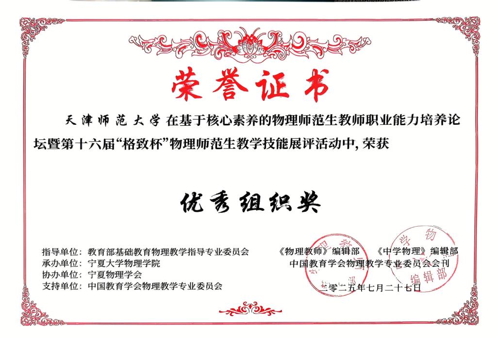 7月25日至27日,基于核心素养的物理师范生教师职业能力培养论坛暨第十六届“格致杯”全国物理师范生教学技能展示与交流活动在宁夏大学举行。本次活动吸引全国百余所高校参与,公司太阳集团tyc9728师生表现突出,共斩获包括“优秀组织奖”在内的11项荣誉,其中温熙雅包揽教学技能展示、创新实验设计与自制教具双项一等奖,陈楷月、侯家瑞、于佳灵、张欣4位同学在两项赛事中均获二等奖。