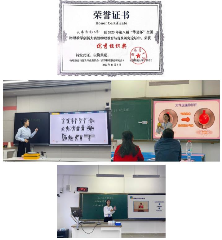 近日,第八届“华夏杯”全国物理教学创新大赛暨物理教育与普及研究论坛在云南师范大学举行。经过紧张激烈的比赛,2021级物理师范生施芷妍、刘睿祺、李雅杰表现出色,均斩获一等奖。其中,施芷妍同时获得“实验创新奖”,并获推参与创新教学大赛优秀作品展示。公司荣获“优秀组织奖”。