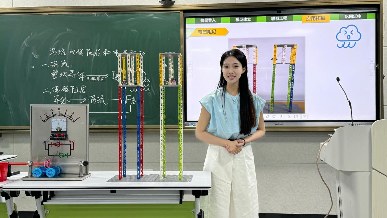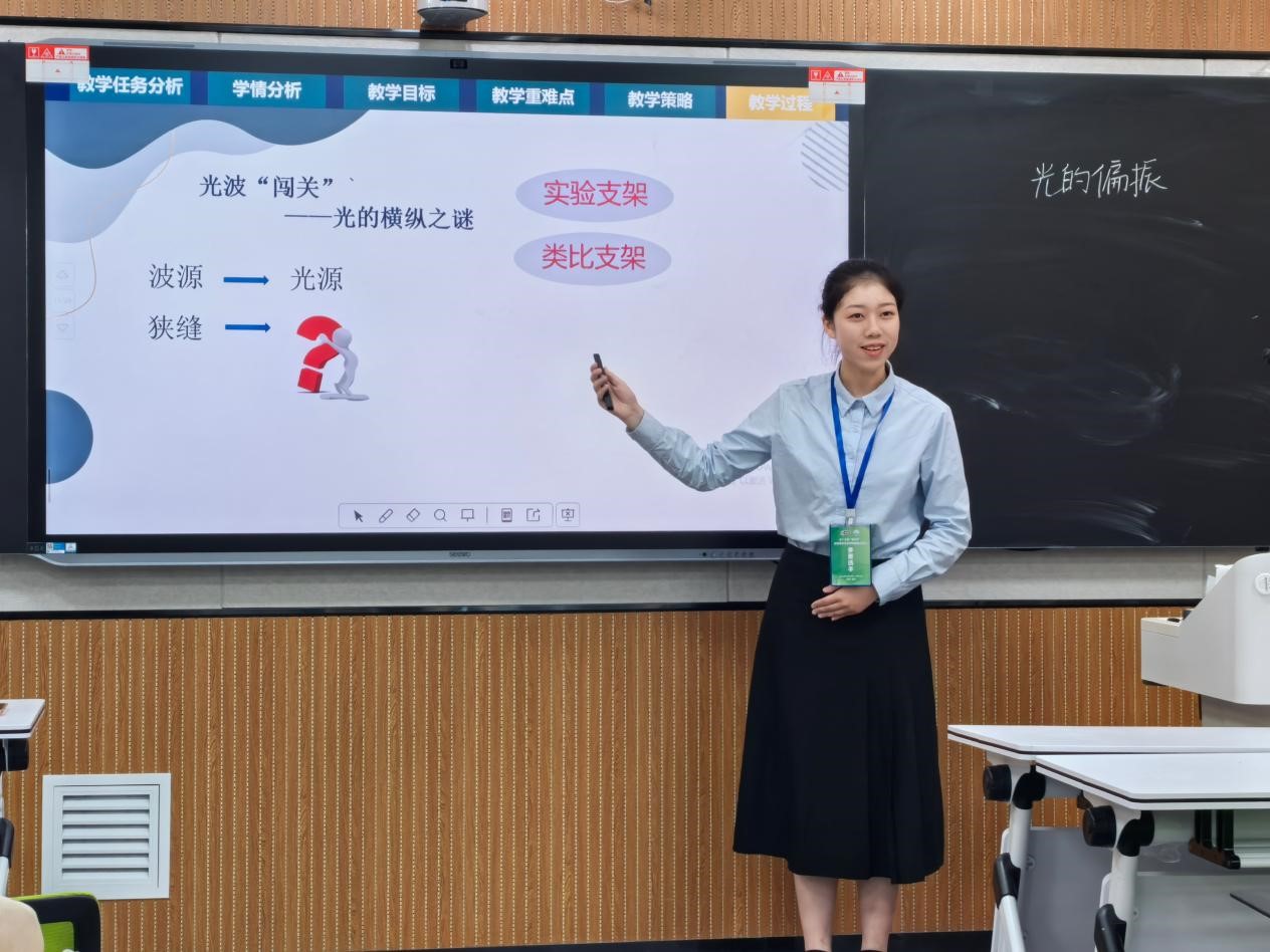 活动中,施芷妍结合可视光路加光传感器,形象展示了光的偏振现象;林慧玲以最新的方式呈现最旧的实验,打造极富趣味的电磁“明星”实验;高可莹以项目式教学的理念展示了反冲的物理实质;陈雨馨制作FAST天眼模拟演示仪讲述光的反射原理;刘蕊利用信息化与教学相融合展示了液体压强的特点及应用。